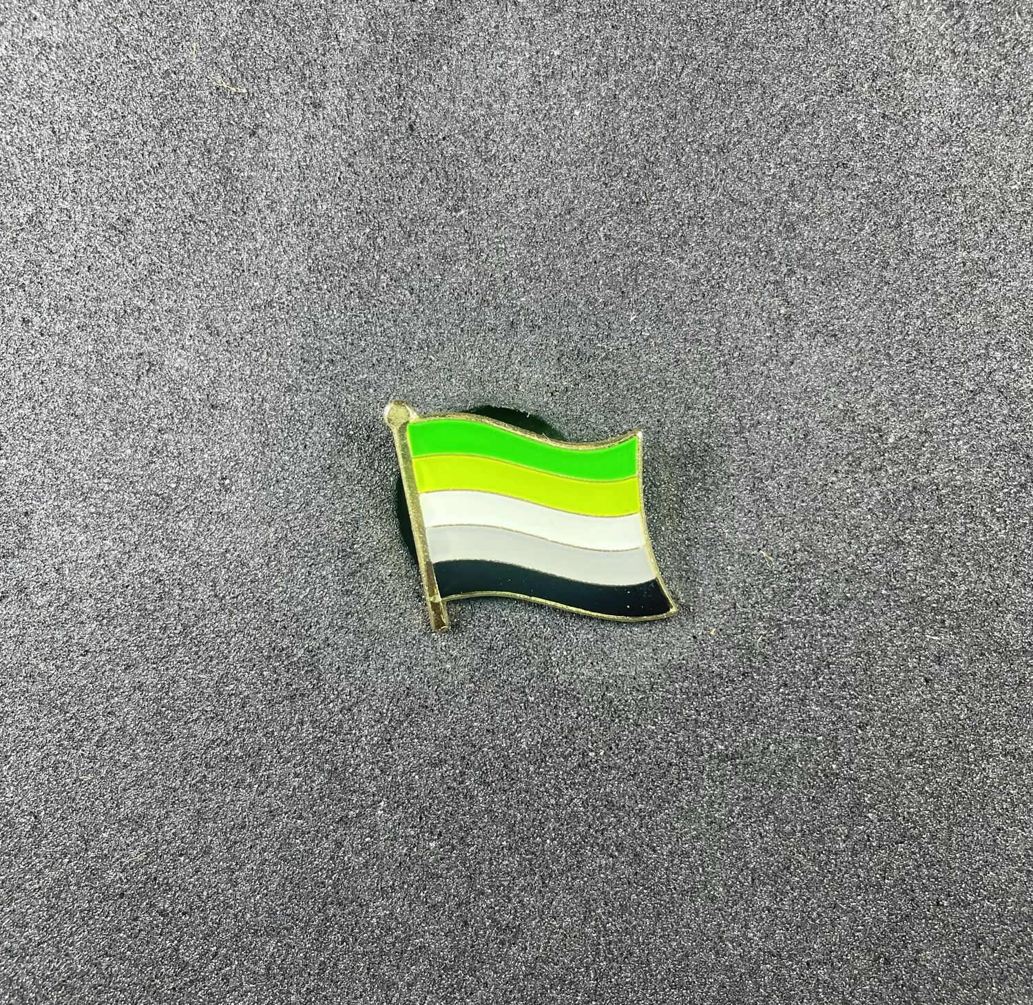 Aromantic Pride flag lapel pins are metal with a butterfly clasp.
